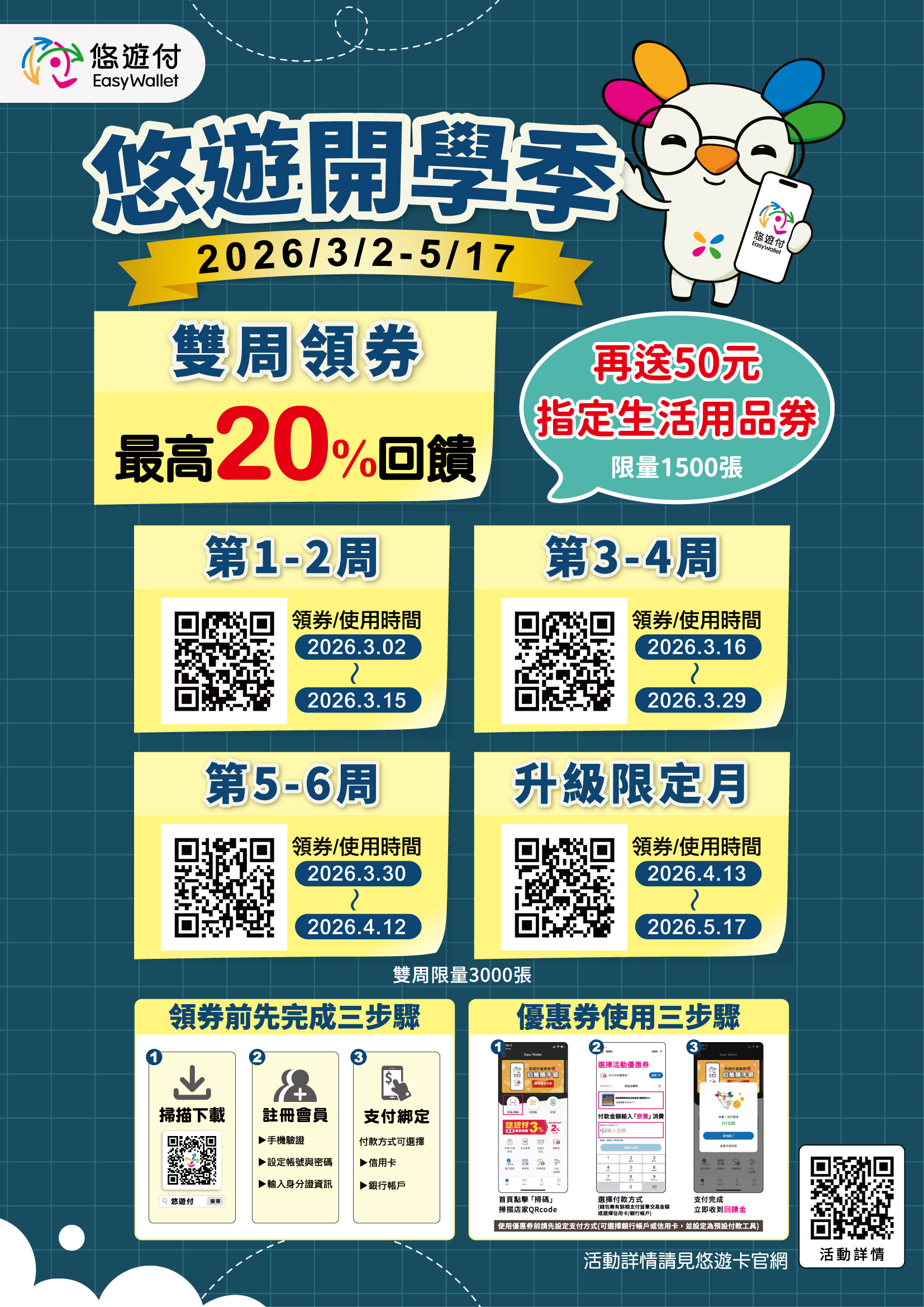 於活動期間,悠遊付會員於「悠遊開學季指定店家」,掃描活動專屬QR Code,即可領取「$20元悠遊付現金回饋券」,每位悠遊付會員每雙週限領取乙次,每雙週回饋名額限量3,000張。本活動總回饋上限為12,000張。$20悠遊付現金回饋券使用方式:限使用於悠遊開學季指定校園店家,且單筆消費滿新台幣$100元(含)以上,方得抵用1張;於成功使用回饋券後,系統將於7天自動發送回饋金至使用者之悠遊付帳戶。若回饋份數已達上限,本活動即告結束,並於悠遊付APP公告。